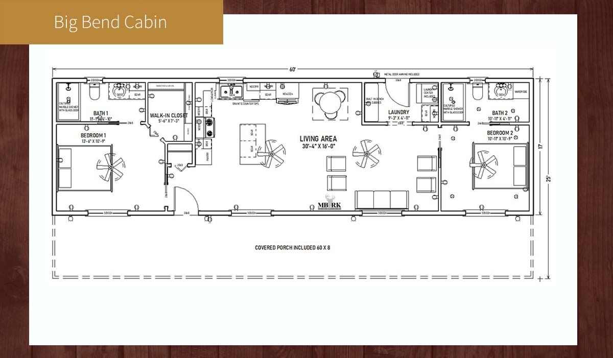 The Big Bend Cabin is the largest and most luxurious floorplan in our two-bedroom collection, offering an expansive 1,020 square feet designed for permanent living or high-end accommodation.