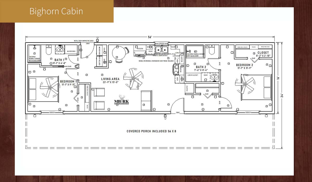 The Bighorn Cabin is built for the challenges of the open range and the comforts of home, offering a maximized 896 square feet of living space in a durable ranch cabin.