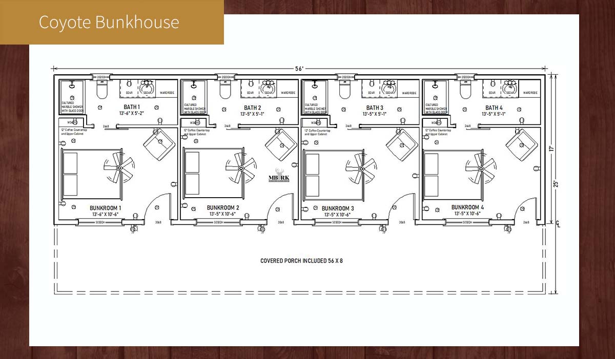 Resilient, Clever, and Built to Survive (17×56)The Coyote Bunkhouse is the ultimate solution for large groups, hunting camps, and operations that demand maximum privacy and capacity from their structures. This 17’x56′ ranch cabin features four completely separate bunkrooms, each with its own full private bathroom.