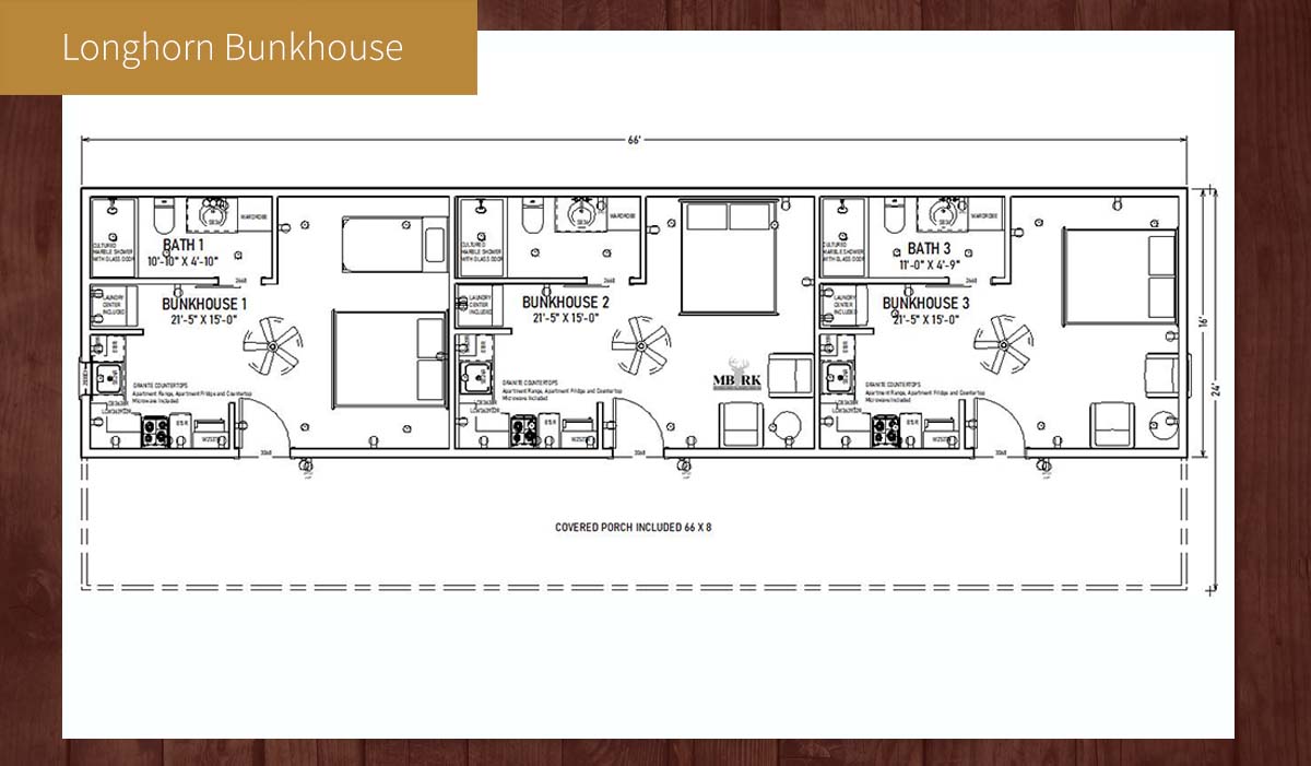 Unmatched Independence and Self-Reliance (16×66)The Longhorn Bunkhouse sets the new standard for durable, self-sufficient housing. Built at a generous 16’x66′, this model is unique because it features three fully independent suites, each equipped with its own private full bath and full apartment-size kitchen.
