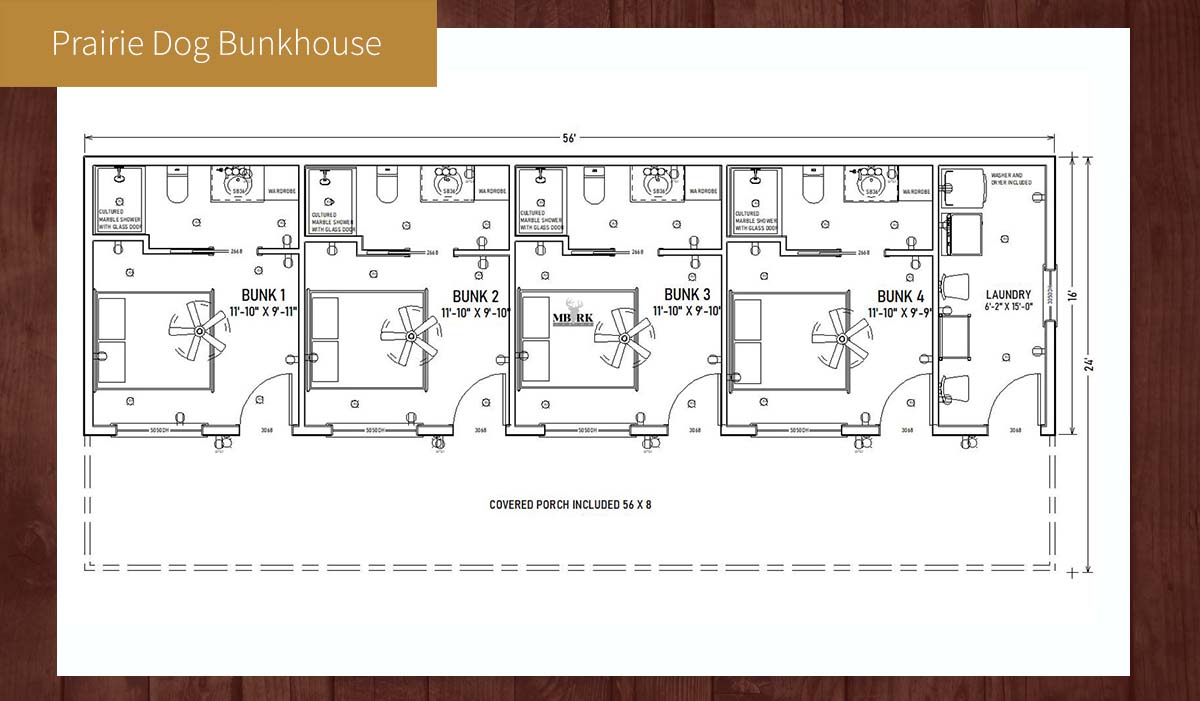 Nature’s Best Community Builder (56×16)The Prairie Dog Bunkhouse Cabin is the ultimate solution for high-volume, private lodging, making it an immediate favorite for any large operation. This unique floorplan features four separate bunk rooms, each with its own full private bath, providing unparalleled privacy and convenience for guests, hunters, or crew.