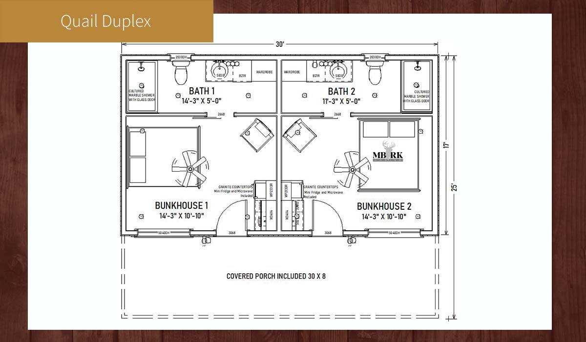 Practicality, Privacy, and Efficiency (17×30)The Quail Duplex is designed to provide maximum privacy and comfort in the smallest, most efficient footprint. This 17’x30′ ranch cabin is built as a true duplex, featuring two completely separate bunkrooms, each with a private full bath and built-in wardrobe.