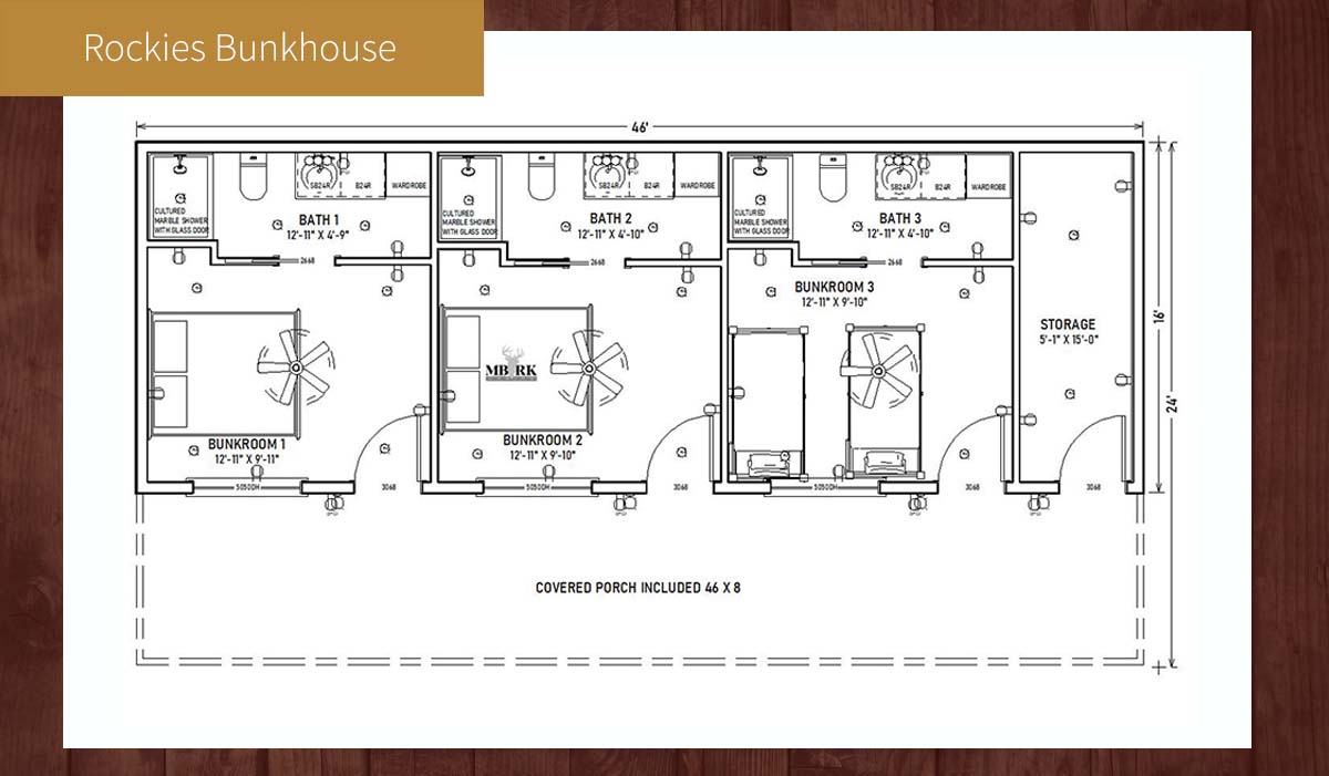 Enduring Strength and Vast Space (46×16)The Rockies Bunkhouse Cabin is built to stand as strong and enduring as the mountain range it’s named for. This three-bedroom unit offers maximum individual privacy, making it the ideal solution for a ranch cabin owner, an upscale hunting cabin lodge, or a profitable rental property.