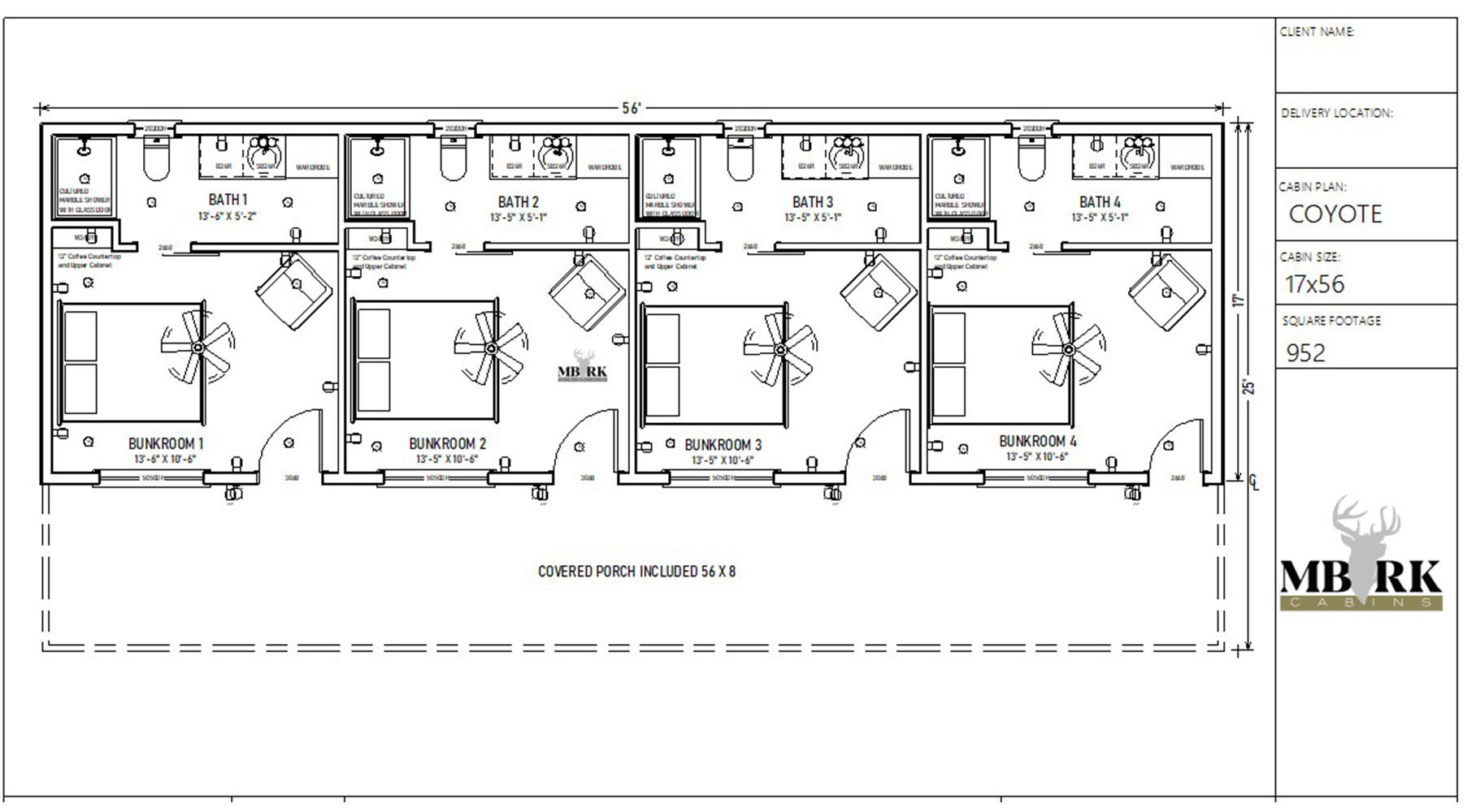 The Coyote Bunkhouse is the ultimate solution for large groups, hunting camps, and operations that demand maximum privacy and capacity from their structures. This 17’x56′ ranch cabin features four completely separate bunkrooms, each with its own full private bathroom. This four-room design is perfect for housing work crews, accommodating multiple hunters, or managing high-volume rental properties. With our signature all-metal floor frame and rodent-proof construction, the Coyote is not your throw-together shed, it’s a high-quality, factory-built structure that is durable, low-maintenance, and delivers superior comfort in the field.