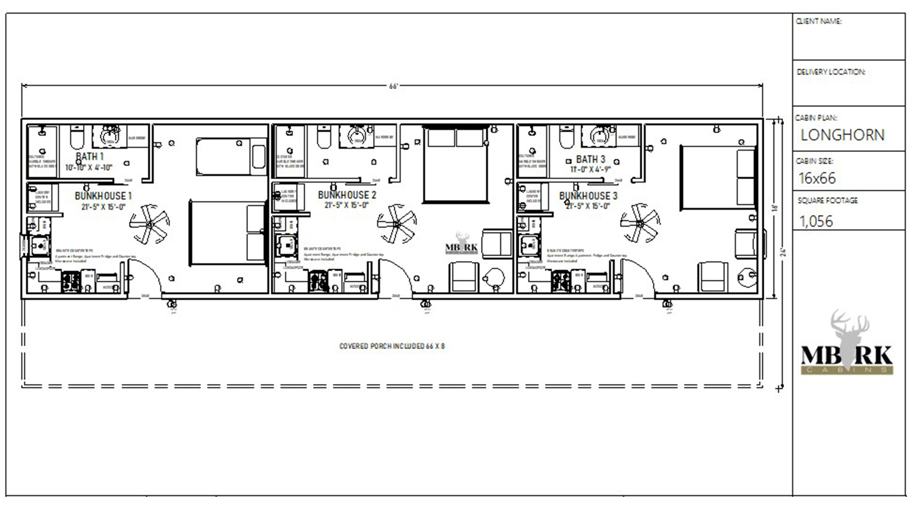 The Longhorn Bunkhouse sets the new standard for durable, self-sufficient housing. Built at a generous 16’x66′, this model is unique because it features three fully independent suites, each equipped with its own private full bath and full apartment-size kitchen. This level of self-contained living is ideal for multi-generational ranch housing, high-end rental property, or long-term crew accommodation where privacy and independence are non-negotiable. Like the legendary animal it’s named for, this ranch cabin stands for strength, endurance, and quality craftsmanship, delivered ready to operate.